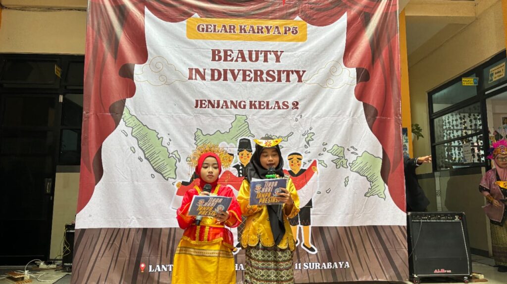 Surabaya, syiarmu.com – Pada Kamis (19/6/2025) pukul 06.30 para siswa mulai berdatangan dengan memakai pakaian adat Jawa, Bali, Kalimantan, Sulawesi atau Papua. Tampak senyum ceria di wajah para siswa kelas 2 karena hari ini para siswa akan tampil menarik di gelar P5 bertajuk “Bhinneka Tunggal Ika” di halaman lantai 2 SD Muhlas.