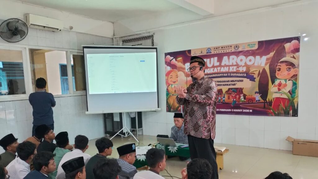 Surabaya, syiarmu.com – Suasana aula Al Husna SMP Muhammadiyah 11 Surabaya (Muven) tampak berbeda pada Jumat (27/2/2026). Seluruh siswa kelas 9 mendapat penguatan motivasi dari motivator nasional Ferry Yudi Antonis Saputra SHI MPdI C.STMI. Tema kegiatan ini adalah mencetak generasi beradab, berilmu, dan berkarakter di era digital.